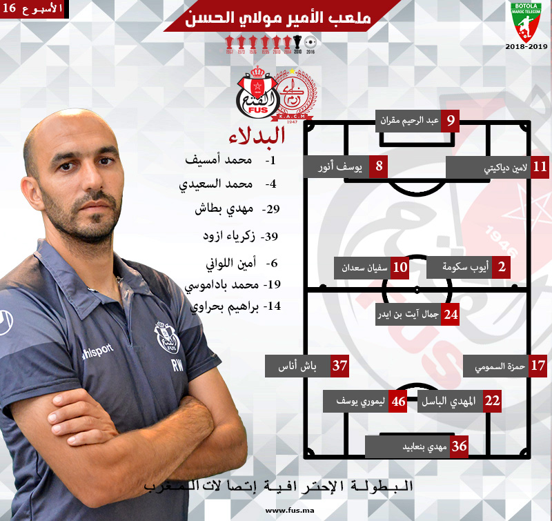 اكتشفوا التشكيلة الرسمية للفتح الرياضي أمام ضيفه الكوكب المراكشي، التي ستجرى في تمام الساعة السابعة من مساء اليوم، على أرضية ملعب الأميرمولاي الحسن، برسم الجولة 16 من الدوري المغربي للمحترفين اتصالات المغرب.