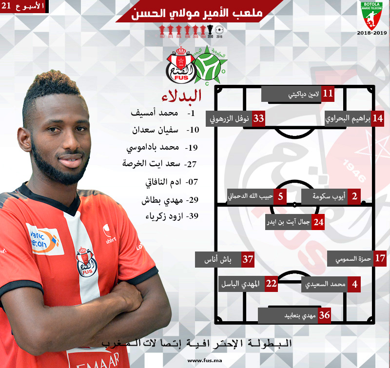 تابعوا التشكيلة الرسمية للفتح الرياضي أمام يوسفية برشيد، التي ستجرى اليوم الجمعة 8 مارس 2019 في تمام الساعة السابعة مساء، على أرضية ملعب الأمير مولاي الحسن، برسم الجولة 21 من الدوري المغربي للمحترفين اتصالات المغرب.